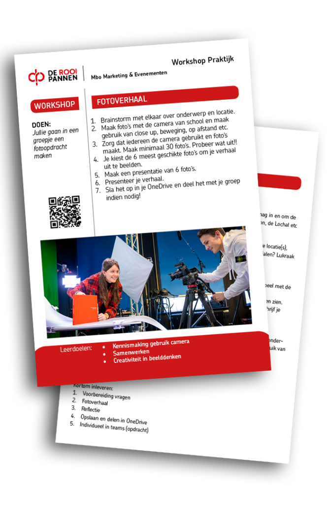 Probeer de camera uit: maak close-ups, beweging, foto hoek, het ‘gluureffect`. Speel met de camera, tenslotte gaat het om kennismaken gebruik camera.