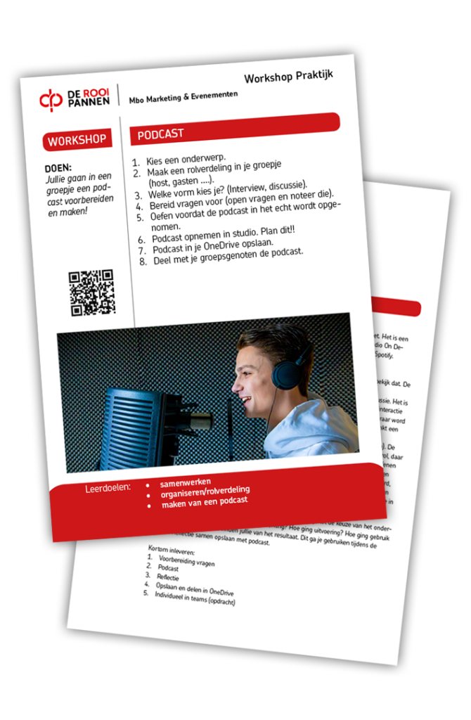 Daarna ga je met elkaar vragen maken, je stelt open vragen ( wie, wat ,hoe… vragen). De host stelt de meeste vragen, maar je maakt ze met elkaar. Iedereen heeft een eigen rol, daar worden de vragen op afgestemd. De vragen noteer je en bewaar je. Dan ga je het oefenen met elkaar. Daarna ga je het in de studio opnemen. Op tijd de studio plannen!! Oefenen is belangrijk, opnemen doe je in een keer. Een van het groepje krijgt de podcast gestuurd, Podcast opslaan in je OneDrive en delen met je groepsgenoten. (Die het ook weer in hun OneDrive opslaan). Lever de opdrachten ook nog individueel via teams in. Bespreek deze in de stream.